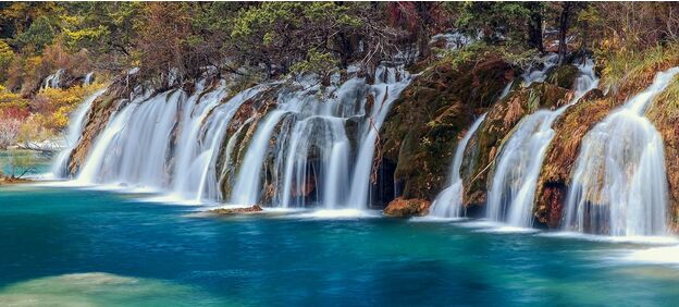 九寨集翠海、疊溪、彩林、雪峰和藏族風情于一體,其自成天成、美麗絕倫的自然風光聞名于世。藍天、白云、雪山、森林、盡融于瀑、河、灘、綴成一串串宛若從天而降的珍珠;其分為則查洼溝、日則溝、樹正溝三條溝,呈“丫”字分布;整個構成了一個五彩斑讕、神奇夢幻的人間仙境,一個不見纖塵、自然純凈的“童話世界”。